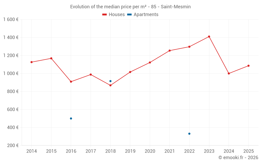 The median price on the 21 house transactions of the last 12 months in the municipality of Saint-Mesmin was 1 000 € per square meter for a median property value of 116 000 €. Over this period, 60% of transactions were between 744 and 1 781 € per square meter (from the 2nd to the 8th deciles).