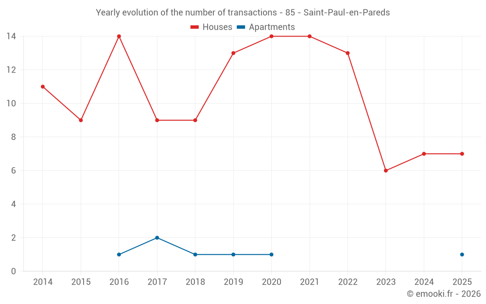 The median price on the 15 house transactions of the last 24 months in the municipality of Saint-Paul-en-Pareds was 2 354 € per square meter for a median property value of 205 000 €. Over this period, 60% of transactions were between 1 378 and 2 796 € per square meter (from the 2nd to the 8th deciles).