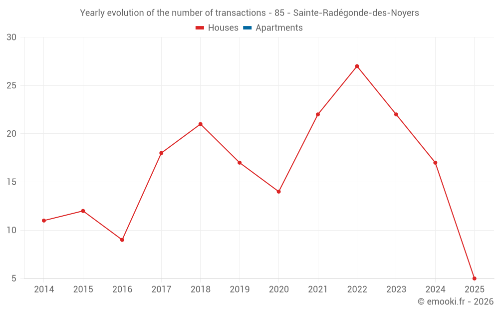 The median price on the 16 house transactions of the last 12 months in the municipality of Sainte-Radégonde-des-Noyers was 1 906 € per square meter for a median property value of 197 500 €. Over this period, 60% of transactions were between 1 231 and 2 460 € per square meter (from the 2nd to the 8th deciles).