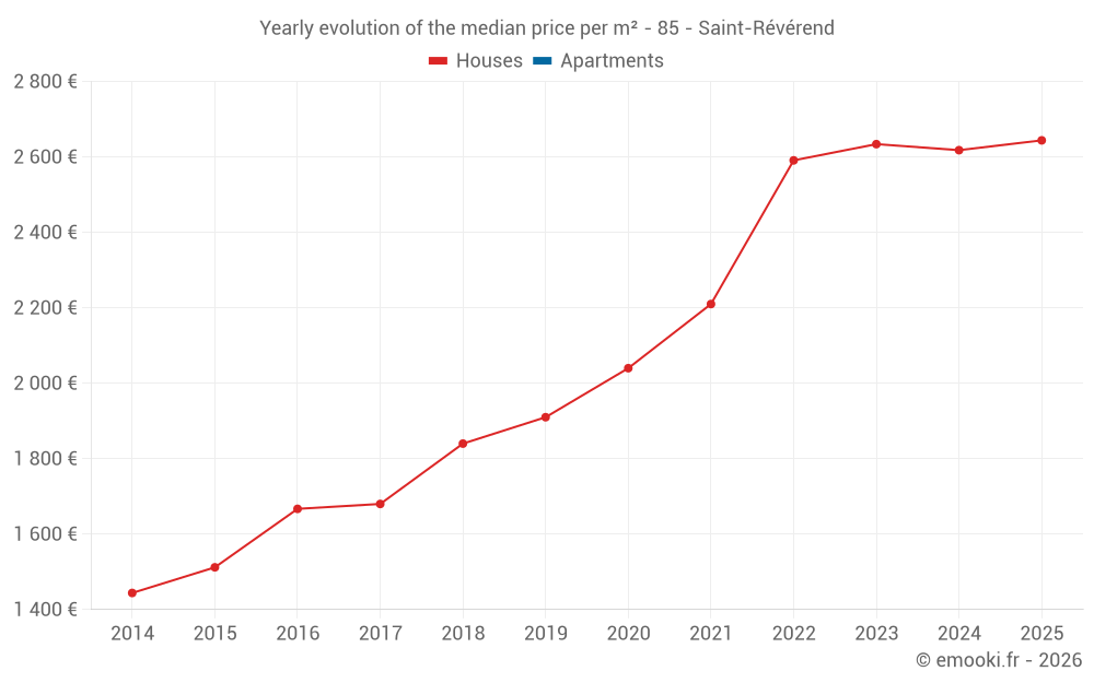 The median price on the 28 house transactions of the last 12 months in the municipality of Saint-Révérend was 2 633 € per square meter for a median property value of 231 000 €. Over this period, 60% of transactions were between 2 142 and 2 969 € per square meter (from the 2nd to the 8th deciles).