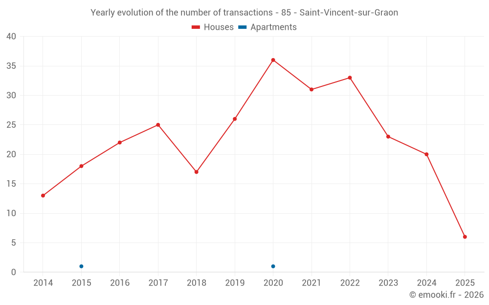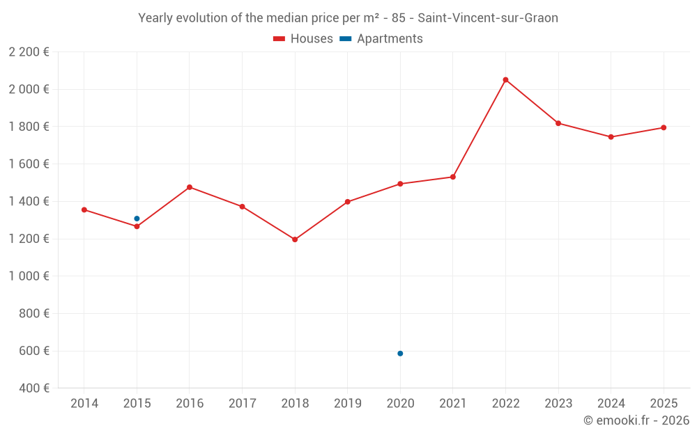 The median price on the 19 house transactions of the last 12 months in the municipality of Saint-Vincent-sur-Graon was 1 818 € per square meter for a median property value of 264 830 €. Over this period, 60% of transactions were between 1 035 and 2 564 € per square meter (from the 2nd to the 8th deciles).