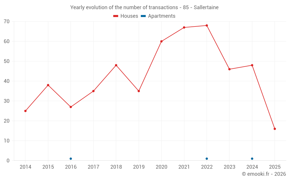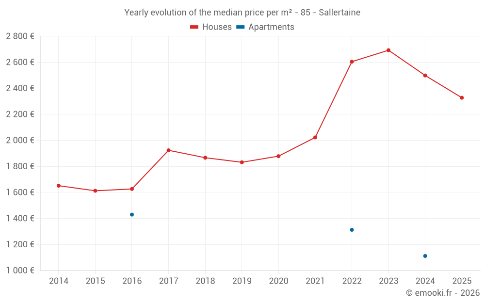 The median price on the 43 house transactions of the last 12 months in the municipality of Sallertaine was 2 419 € per square meter for a median property value of 247 500 €. Over this period, 60% of transactions were between 1 790 and 2 939 € per square meter (from the 2nd to the 8th deciles).