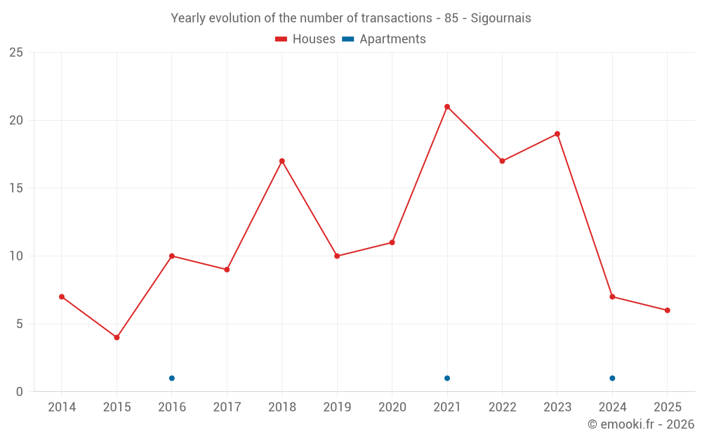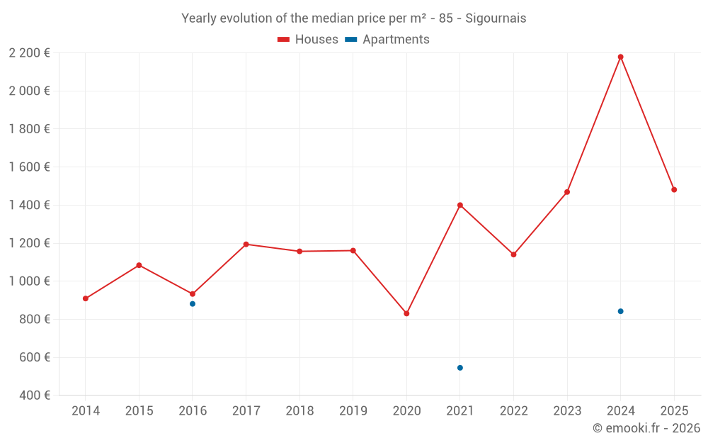 The median price on the 21 house transactions of the last 24 months in the municipality of Sigournais was 1 495 € per square meter for a median property value of 149 000 €. Over this period, 60% of transactions were between 1 141 and 2 308 € per square meter (from the 2nd to the 8th deciles).