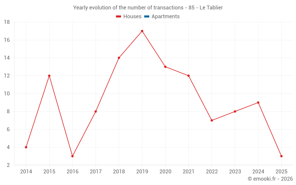 The median price on the 16 house transactions of the last 24 months in the municipality of Le Tablier was 2 162 € per square meter for a median property value of 214 000 €. Over this period, 60% of transactions were between 1 836 and 2 389 € per square meter (from the 2nd to the 8th deciles).
