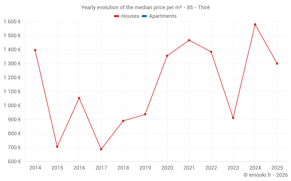 The median price on the 19 house transactions of the last 24 months in the municipality of Thiré was 1 391 € per square meter for a median property value of 148 000 €. Over this period, 60% of transactions were between 899 and 2 018 € per square meter (from the 2nd to the 8th deciles).