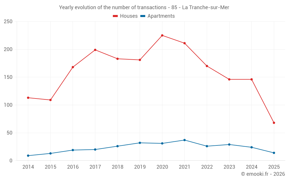 The median price on the 37 house transactions of the last 3 months in the municipality of La Tranche-sur-Mer was 3 585 € per square meter for a median property value of 269 000 €. Over this period, 60% of transactions were between 2 755 and 4 525 € per square meter (from the 2nd to the 8th deciles).