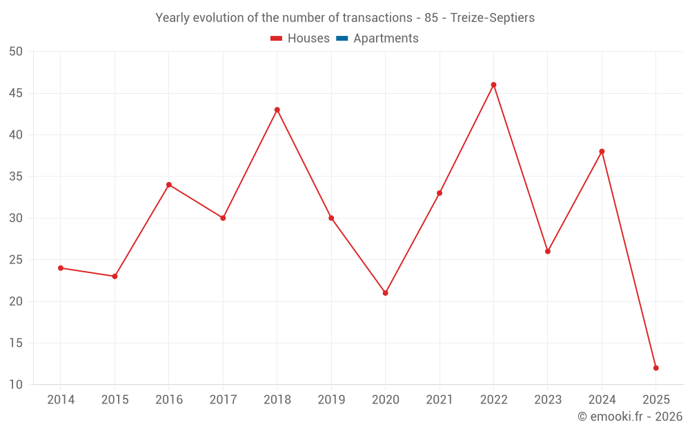 The median price on the 35 house transactions of the last 12 months in the municipality of Treize-Septiers was 1 803 € per square meter for a median property value of 175 000 €. Over this period, 60% of transactions were between 1 243 and 2 242 € per square meter (from the 2nd to the 8th deciles).