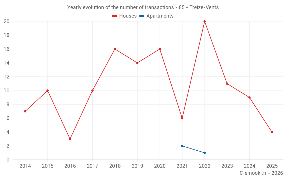 The median price on the 20 house transactions of the last 24 months in the municipality of Treize-Vents was 1 879 € per square meter for a median property value of 180 000 €. Over this period, 60% of transactions were between 1 046 and 2 165 € per square meter (from the 2nd to the 8th deciles).