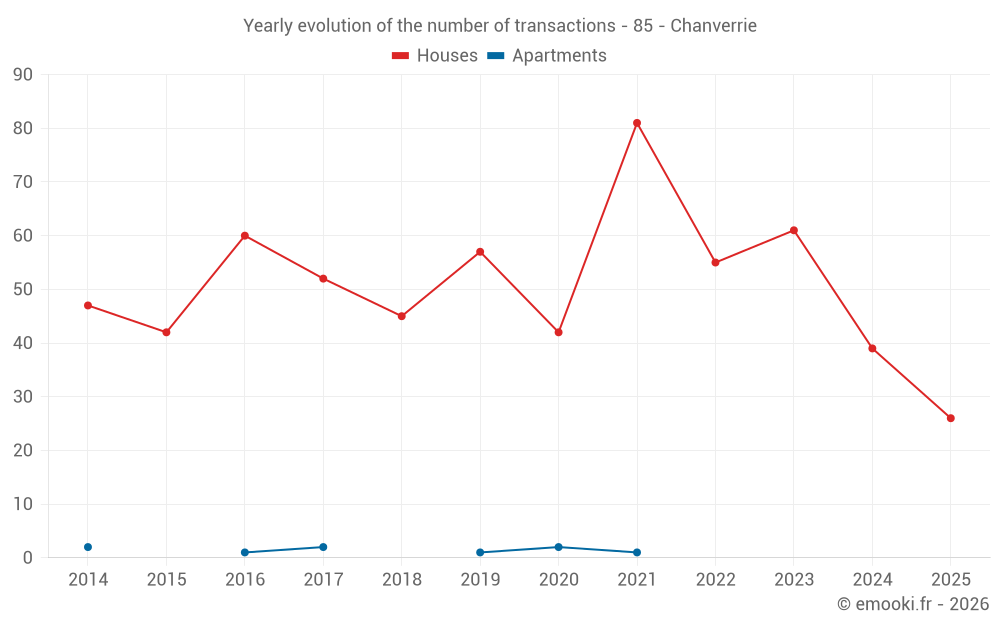 The median price on the 26 house transactions of the last 6 months in the municipality of Chanverrie was 2 137 € per square meter for a median property value of 199 800 €. Over this period, 60% of transactions were between 1 313 and 2 500 € per square meter (from the 2nd to the 8th deciles).