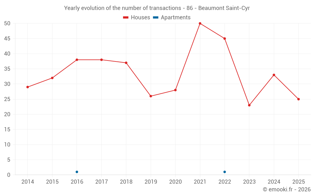 The median price on the 25 house transactions of the last 12 months in the municipality of Beaumont Saint-Cyr was 1 479 € per square meter for a median property value of 146 001 €. Over this period, 60% of transactions were between 1 184 and 1 973 € per square meter (from the 2nd to the 8th deciles).