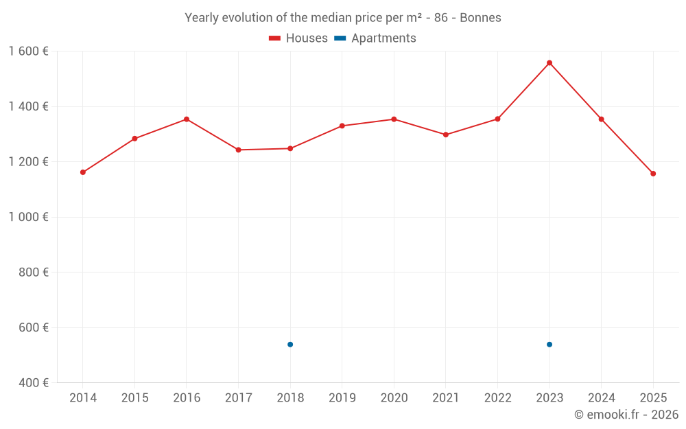 The median price on the 17 house transactions of the last 12 months in the municipality of Bonnes was 1 222 € per square meter for a median property value of 99 000 €. Over this period, 60% of transactions were between 382 and 2 024 € per square meter (from the 2nd to the 8th deciles).