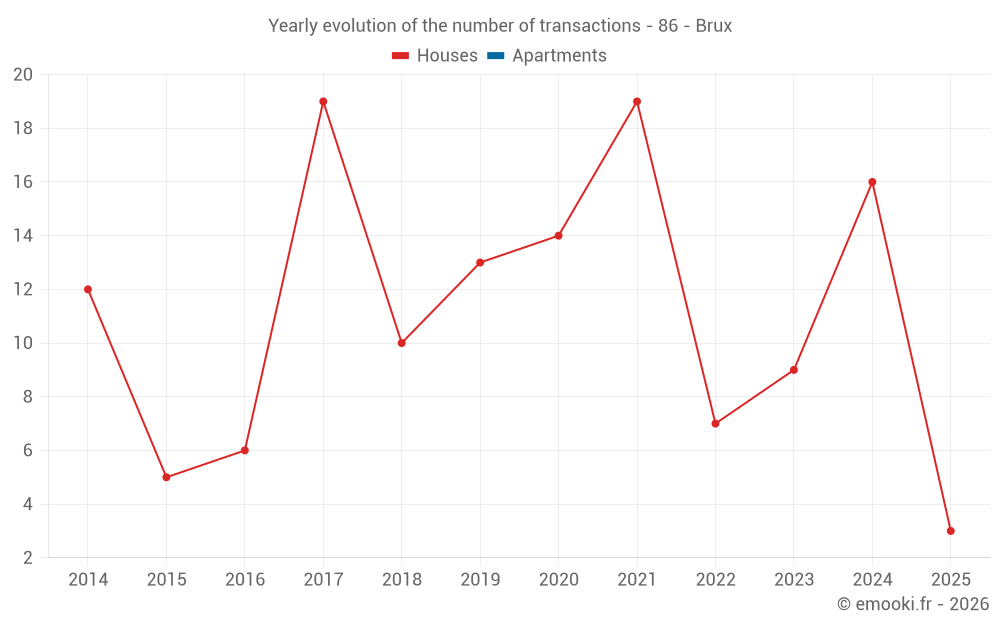 The median price on the 25 house transactions of the last 24 months in the municipality of Brux was 1 141 € per square meter for a median property value of 105 000 €. Over this period, 60% of transactions were between 683 and 1 470 € per square meter (from the 2nd to the 8th deciles).