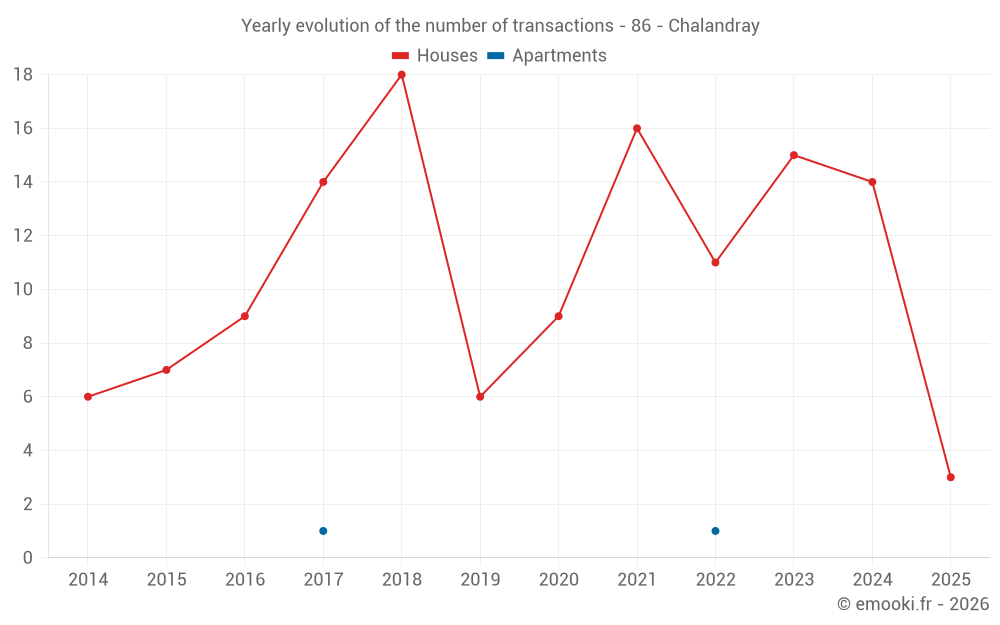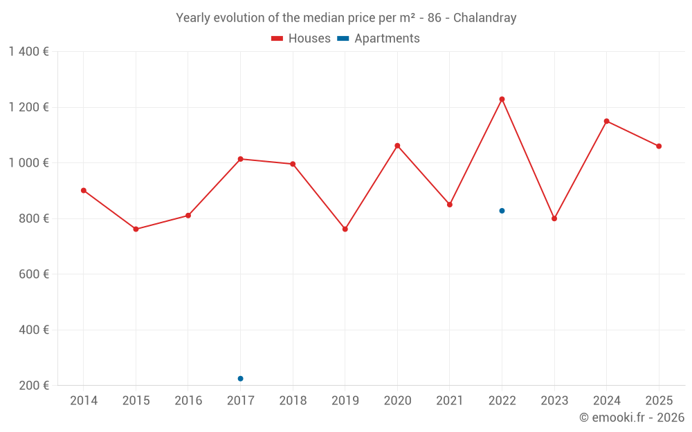 The median price on the 26 house transactions of the last 24 months in the municipality of Chalandray was 928 € per square meter for a median property value of 79 915 €. Over this period, 60% of transactions were between 520 and 1 643 € per square meter (from the 2nd to the 8th deciles).