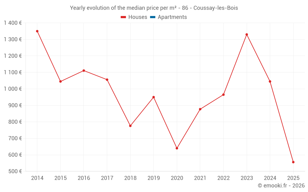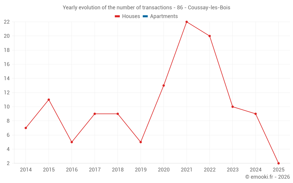 The median price on the 18 house transactions of the last 24 months in the municipality of Coussay-les-Bois was 1 074 € per square meter for a median property value of 99 750 €. Over this period, 60% of transactions were between 651 and 1 825 € per square meter (from the 2nd to the 8th deciles).
