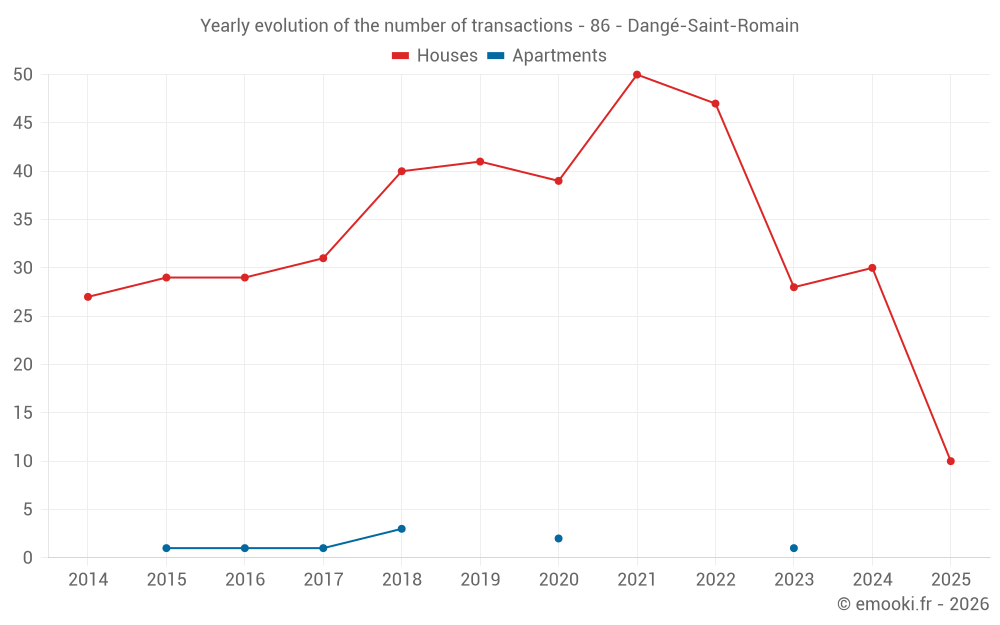 The median price on the 30 house transactions of the last 12 months in the municipality of Dangé-Saint-Romain was 1 254 € per square meter for a median property value of 114 500 €. Over this period, 60% of transactions were between 982 and 1 698 € per square meter (from the 2nd to the 8th deciles).