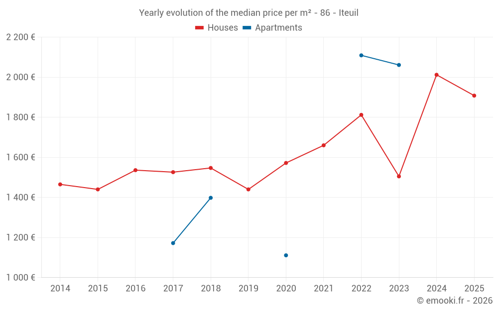 The median price on the 28 house transactions of the last 12 months in the municipality of Iteuil was 1 969 € per square meter for a median property value of 173 250 €. Over this period, 60% of transactions were between 1 620 and 2 353 € per square meter (from the 2nd to the 8th deciles).
