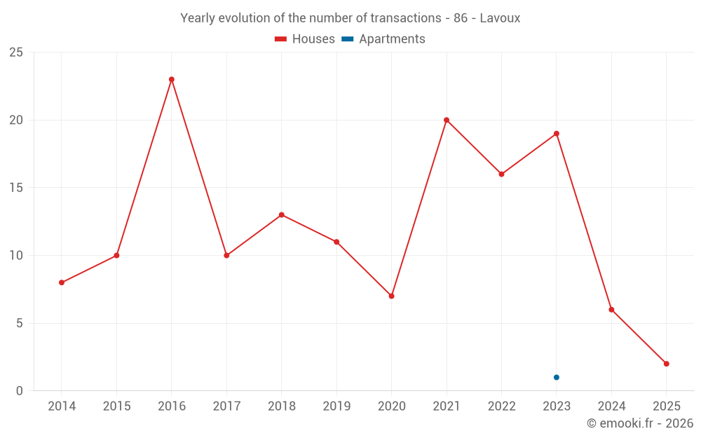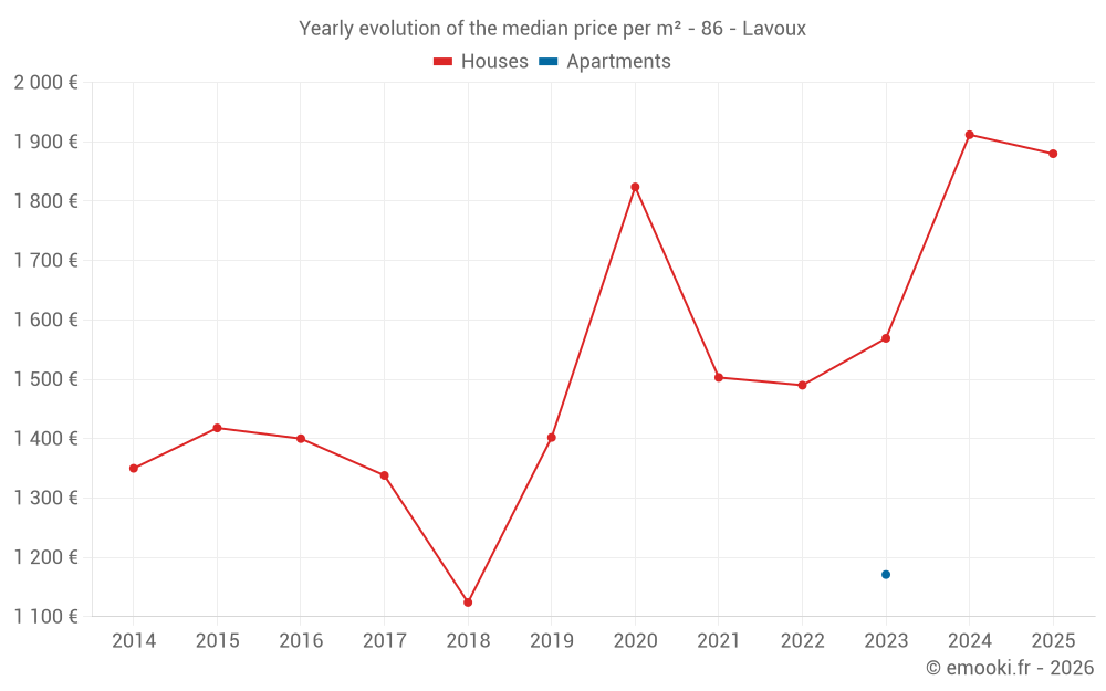 The median price on the 18 house transactions of the last 24 months in the municipality of Lavoux was 1 912 € per square meter for a median property value of 215 790 €. Over this period, 60% of transactions were between 1 549 and 2 226 € per square meter (from the 2nd to the 8th deciles).