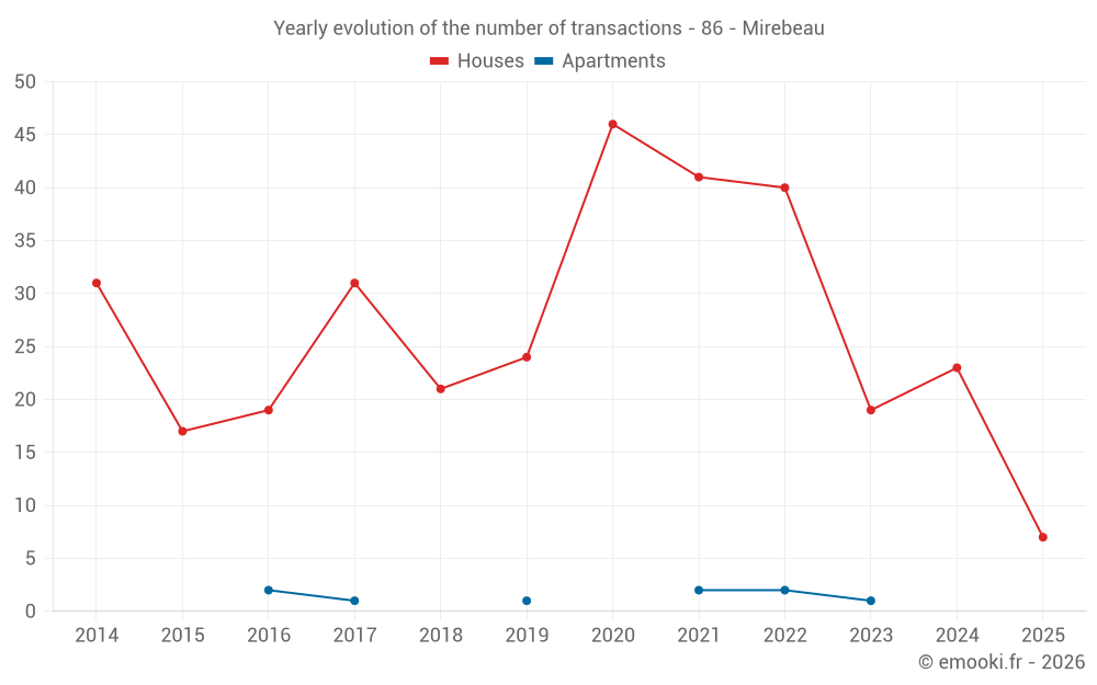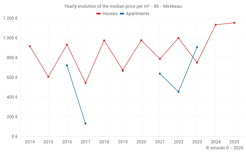 The median price on the 20 house transactions of the last 12 months in the municipality of Mirebeau was 1 158 € per square meter for a median property value of 111 000 €. Over this period, 60% of transactions were between 712 and 1 601 € per square meter (from the 2nd to the 8th deciles).