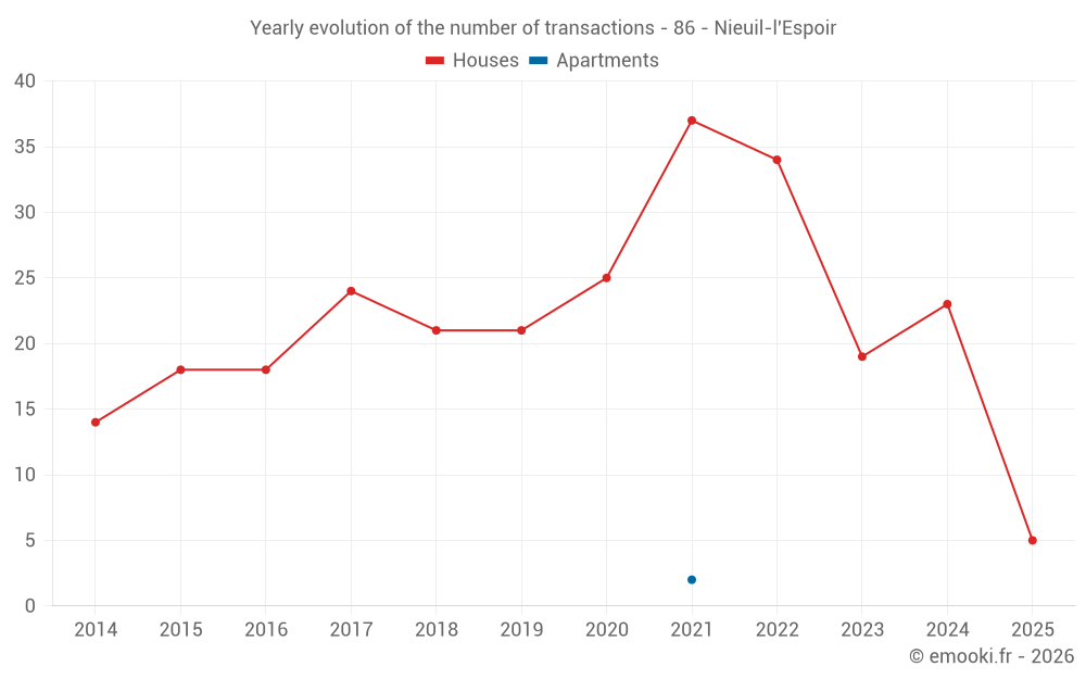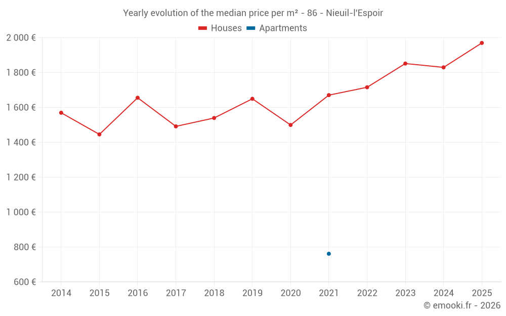 The median price on the 16 house transactions of the last 12 months in the municipality of Nieuil-l'Espoir was 1 908 € per square meter for a median property value of 212 500 €. Over this period, 60% of transactions were between 1 699 and 2 287 € per square meter (from the 2nd to the 8th deciles).