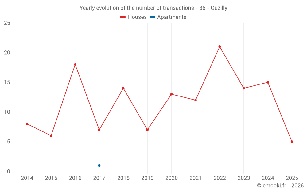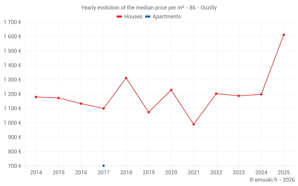 The median price on the 29 house transactions of the last 24 months in the municipality of Ouzilly was 1 280 € per square meter for a median property value of 135 000 €. Over this period, 60% of transactions were between 898 and 1 775 € per square meter (from the 2nd to the 8th deciles).
