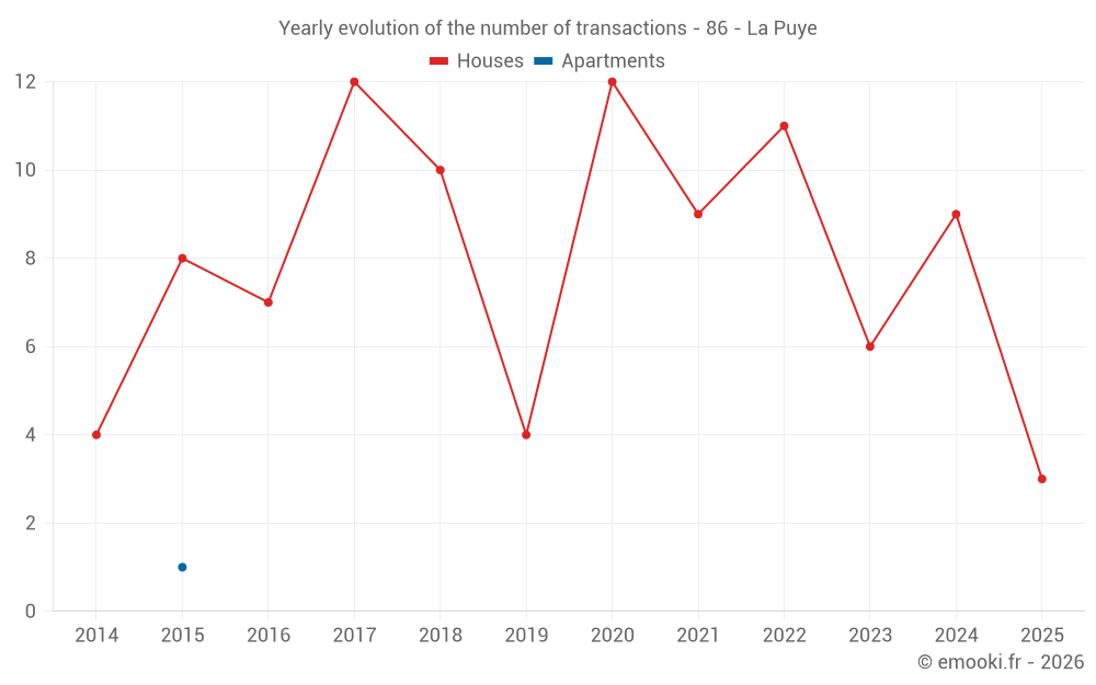 The median price on the 15 house transactions of the last 24 months in the municipality of La Puye was 736 € per square meter for a median property value of 74 000 €. Over this period, 60% of transactions were between 472 and 1 187 € per square meter (from the 2nd to the 8th deciles).