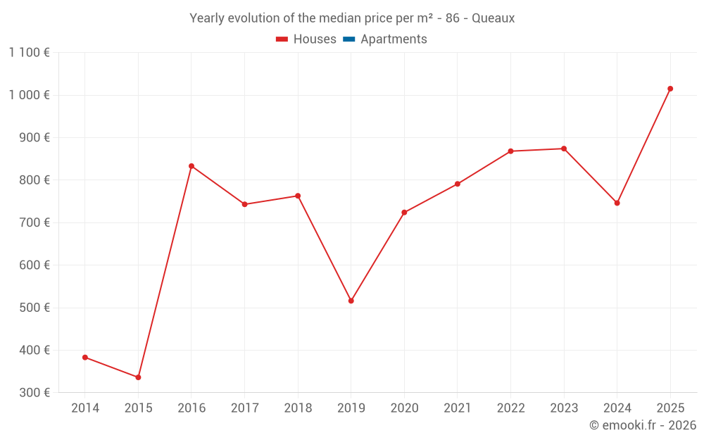 The median price on the 16 house transactions of the last 12 months in the municipality of Queaux was 983 € per square meter for a median property value of 88 734 €. Over this period, 60% of transactions were between 719 and 1 129 € per square meter (from the 2nd to the 8th deciles).