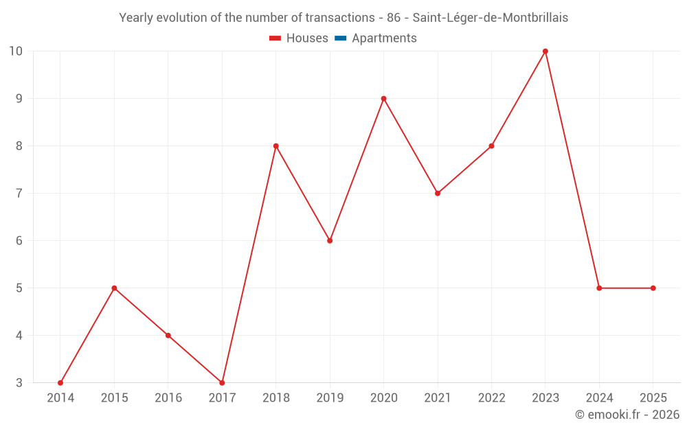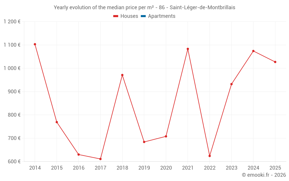 The median price on the 16 house transactions of the last 24 months in the municipality of Saint-Léger-de-Montbrillais was 1 016 € per square meter for a median property value of 85 700 €. Over this period, 60% of transactions were between 208 and 1 260 € per square meter (from the 2nd to the 8th deciles).