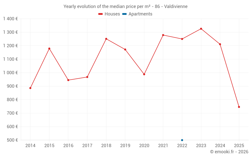 The median price on the 29 house transactions of the last 12 months in the municipality of Valdivienne was 1 160 € per square meter for a median property value of 100 000 €. Over this period, 60% of transactions were between 597 and 1 543 € per square meter (from the 2nd to the 8th deciles).