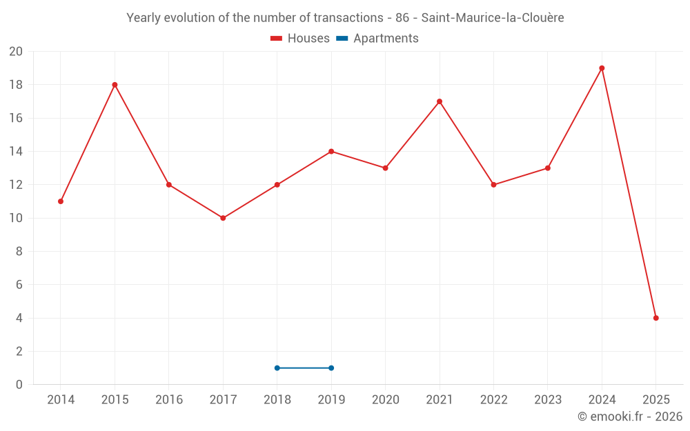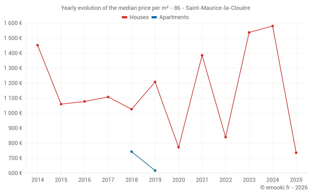 The median price on the 32 house transactions of the last 24 months in the municipality of Saint-Maurice-la-Clouère was 1 524 € per square meter for a median property value of 140 750 €. Over this period, 60% of transactions were between 778 and 1 921 € per square meter (from the 2nd to the 8th deciles).