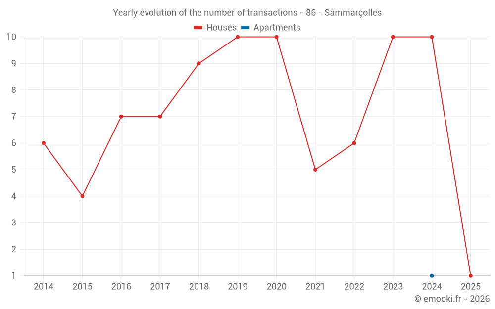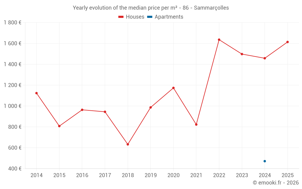 The median price on the 17 house transactions of the last 24 months in the municipality of Sammarçolles was 1 452 € per square meter for a median property value of 138 000 €. Over this period, 60% of transactions were between 737 and 1 778 € per square meter (from the 2nd to the 8th deciles).