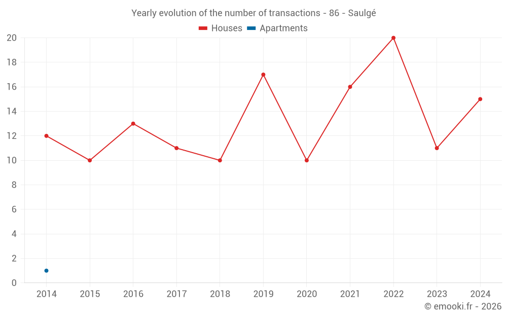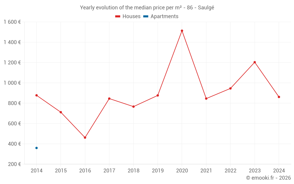 The median price on the 21 house transactions of the last 24 months in the municipality of Saulgé was 862 € per square meter for a median property value of 78 000 €. Over this period, 60% of transactions were between 538 and 1 674 € per square meter (from the 2nd to the 8th deciles).