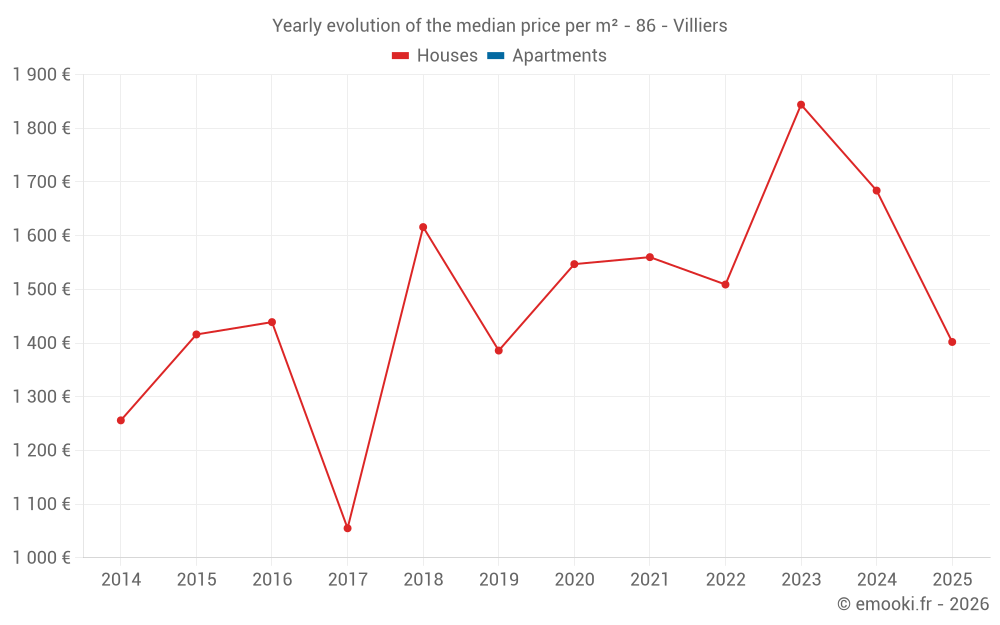 The median price on the 14 house transactions of the last 24 months in the municipality of Villiers was 1 752 € per square meter for a median property value of 180 000 €. Over this period, 60% of transactions were between 1 289 and 2 047 € per square meter (from the 2nd to the 8th deciles).
