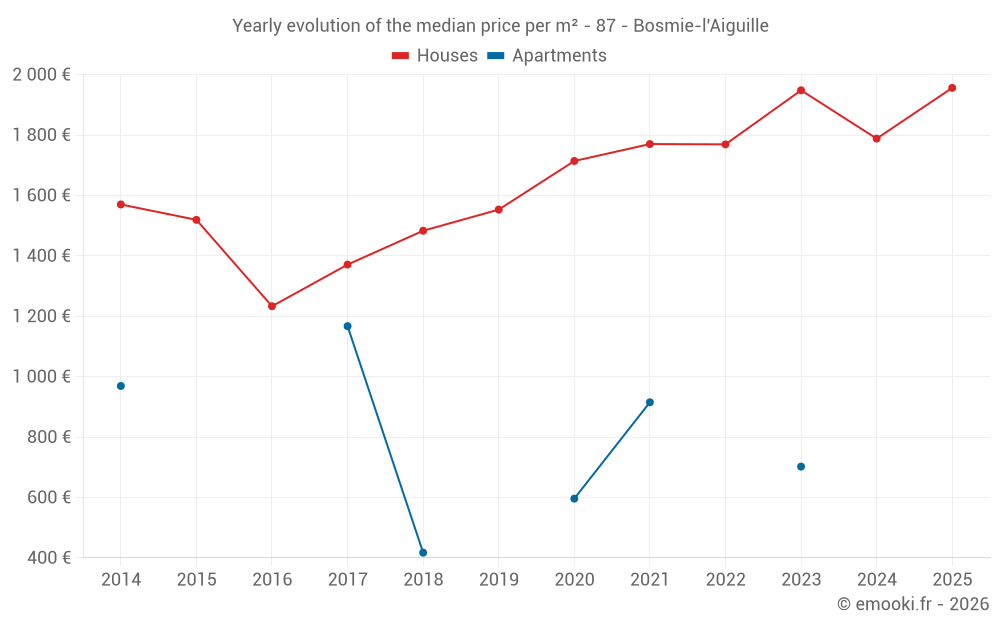 The median price on the 17 house transactions of the last 12 months in the municipality of Bosmie-l'Aiguille was 1 895 € per square meter for a median property value of 156 500 €. Over this period, 60% of transactions were between 1 238 and 2 312 € per square meter (from the 2nd to the 8th deciles).