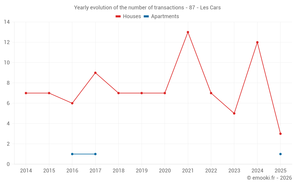 The median price on the 16 house transactions of the last 24 months in the municipality of Les Cars was 790 € per square meter for a median property value of 95 150 €. Over this period, 60% of transactions were between 581 and 1 471 € per square meter (from the 2nd to the 8th deciles).