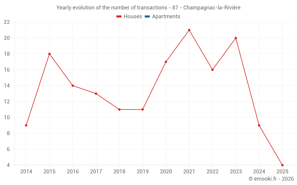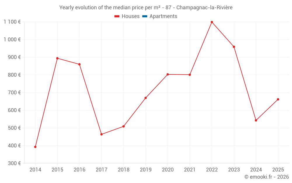 The median price on the 19 house transactions of the last 24 months in the municipality of Champagnac-la-Rivière was 903 € per square meter for a median property value of 55 000 €. Over this period, 60% of transactions were between 275 and 1 522 € per square meter (from the 2nd to the 8th deciles).