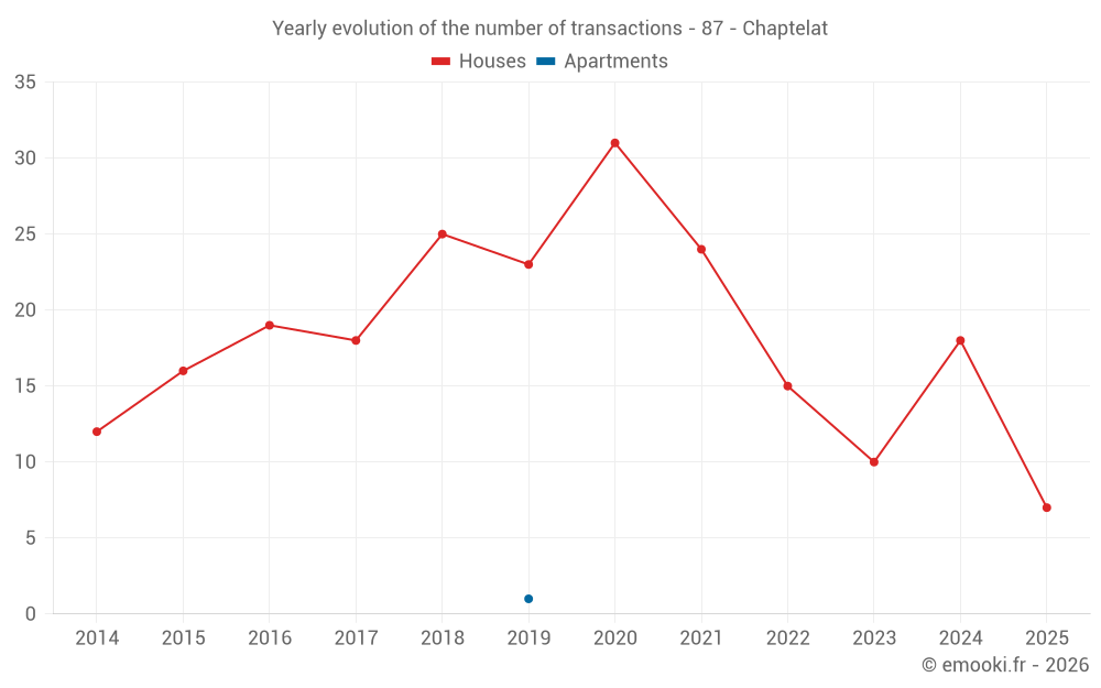 The median price on the 33 house transactions of the last 24 months in the municipality of Chaptelat was 1 955 € per square meter for a median property value of 210 000 €. Over this period, 60% of transactions were between 1 351 and 2 382 € per square meter (from the 2nd to the 8th deciles).