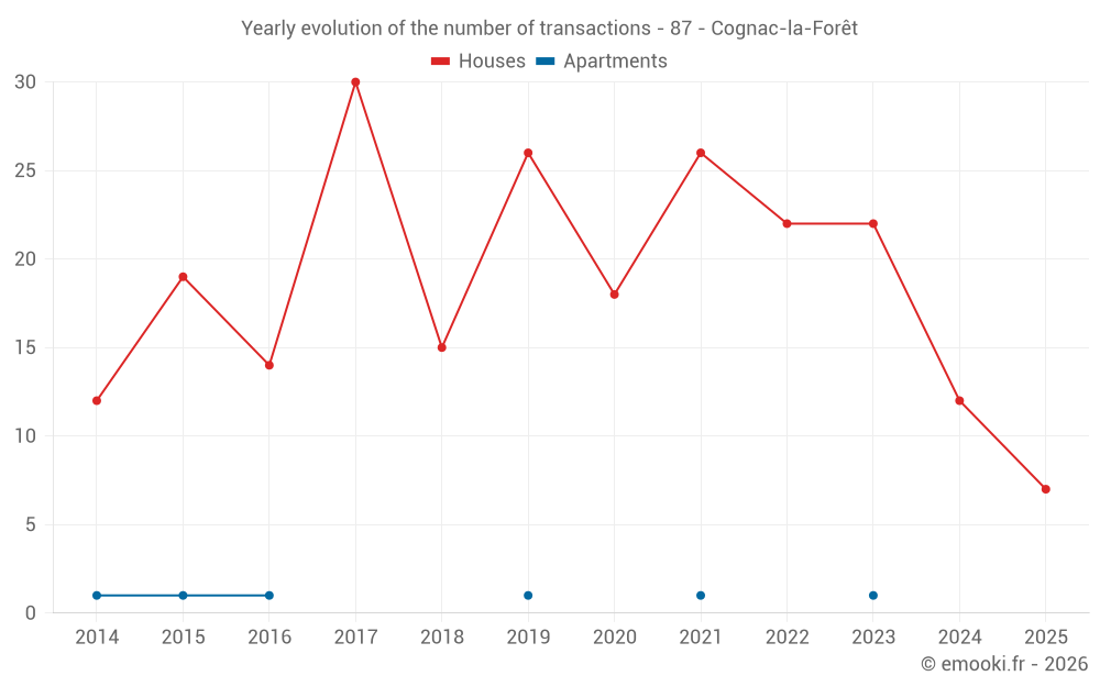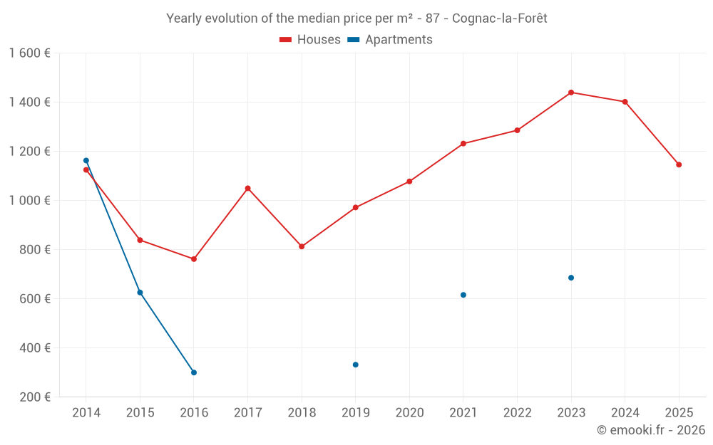 The median price on the 31 house transactions of the last 24 months in the municipality of Cognac-la-Forêt was 1 433 € per square meter for a median property value of 110 092 €. Over this period, 60% of transactions were between 641 and 1 783 € per square meter (from the 2nd to the 8th deciles).