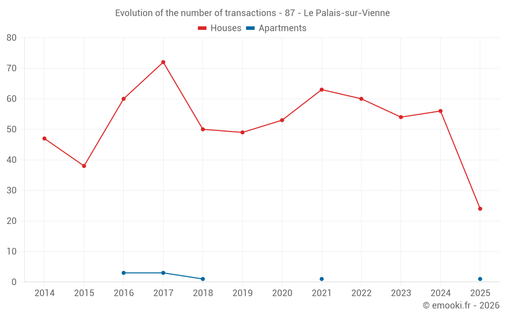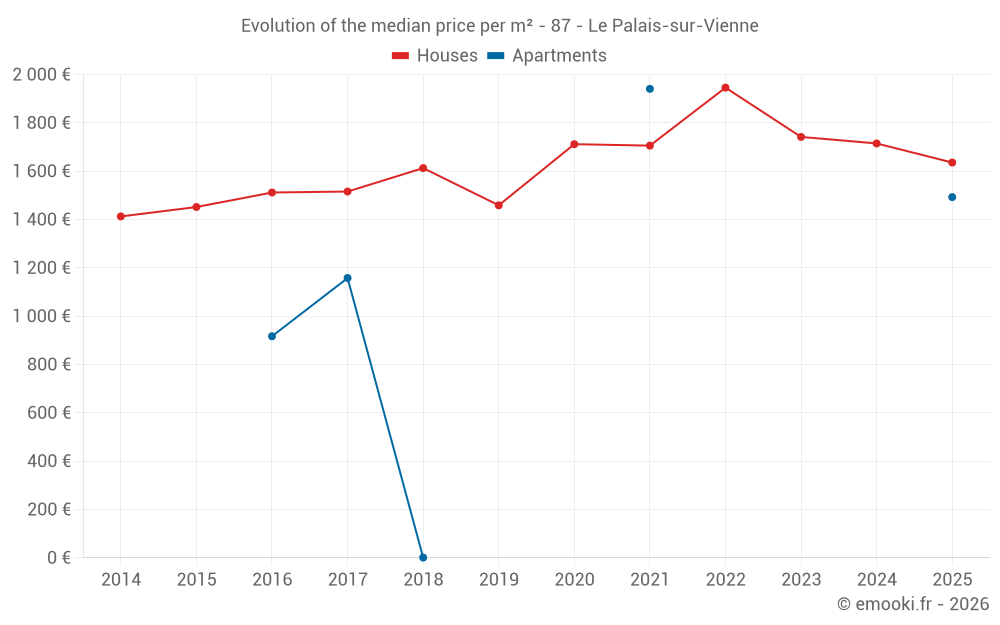 The median price on the 24 house transactions of the last 6 months in the municipality of Le Palais-sur-Vienne was 1 636 € per square meter for a median property value of 157 910 €. Over this period, 60% of transactions were between 1 051 and 1 872 € per square meter (from the 2nd to the 8th deciles).