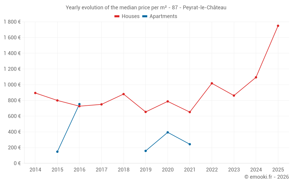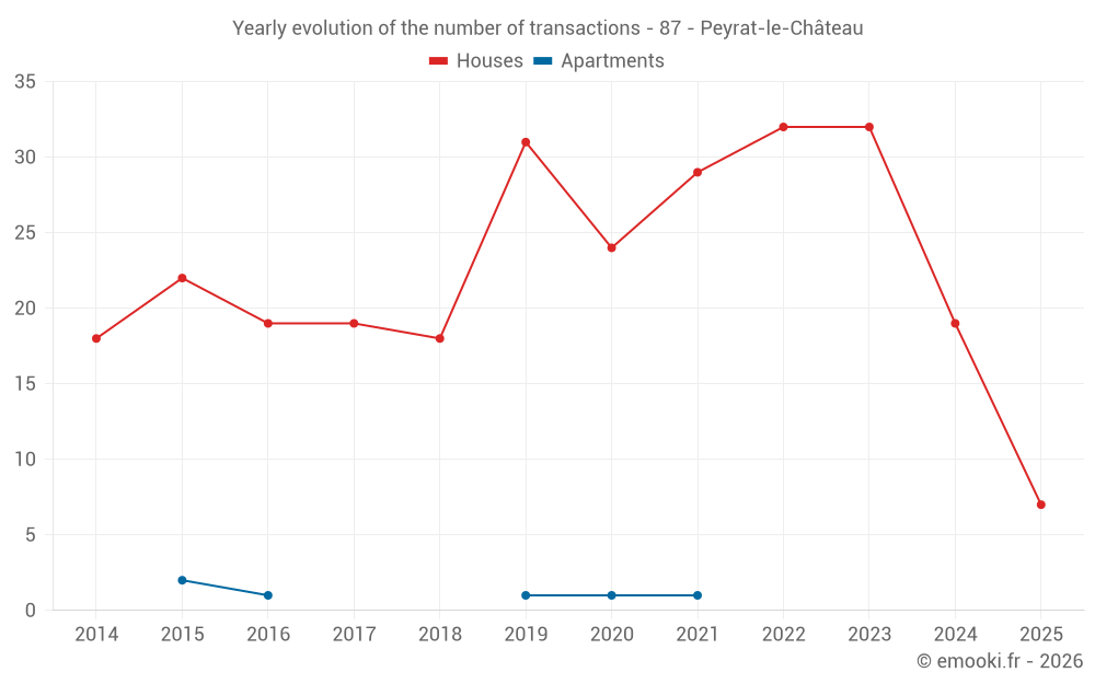 The median price on the 19 house transactions of the last 12 months in the municipality of Peyrat-le-Château was 1 500 € per square meter for a median property value of 113 000 €. Over this period, 60% of transactions were between 875 and 2 046 € per square meter (from the 2nd to the 8th deciles).