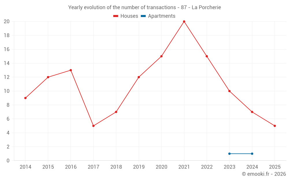 The median price on the 16 house transactions of the last 24 months in the municipality of La Porcherie was 1 179 € per square meter for a median property value of 102 250 €. Over this period, 60% of transactions were between 615 and 1 929 € per square meter (from the 2nd to the 8th deciles).