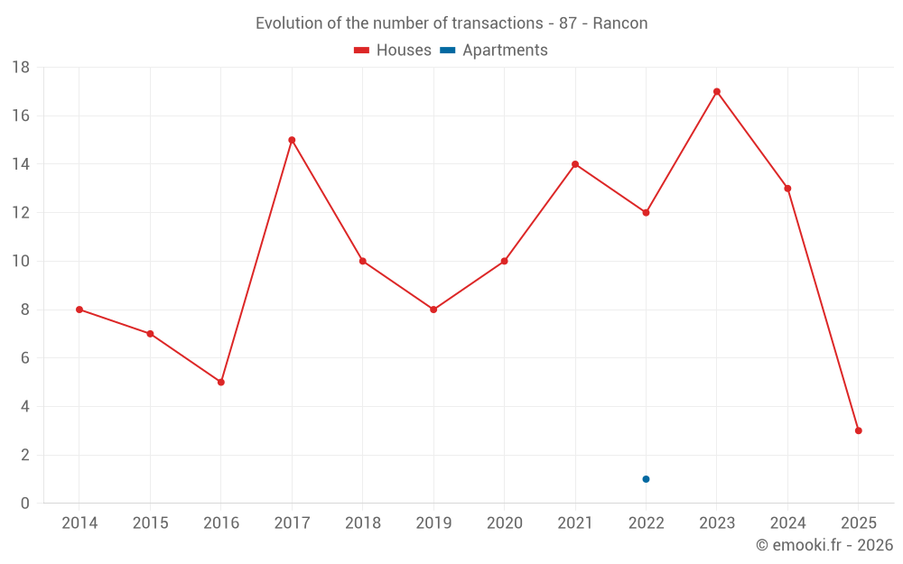 The median price on the 23 house transactions of the last 24 months in the municipality of Rancon was 744 € per square meter for a median property value of 64 000 €. Over this period, 60% of transactions were between 537 and 1 312 € per square meter (from the 2nd to the 8th deciles).