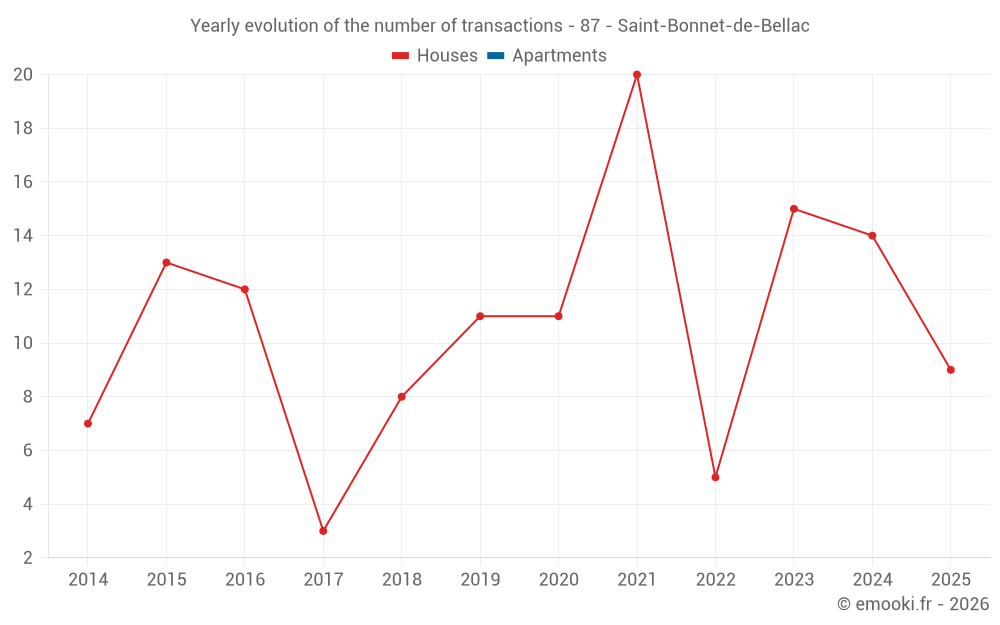 The median price on the 30 house transactions of the last 24 months in the municipality of Saint-Bonnet-de-Bellac was 522 € per square meter for a median property value of 51 250 €. Over this period, 60% of transactions were between 226 and 1 257 € per square meter (from the 2nd to the 8th deciles).