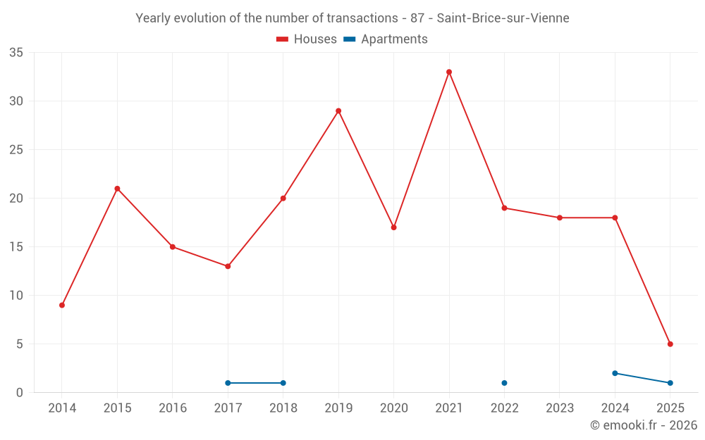 The median price on the 16 house transactions of the last 12 months in the municipality of Saint-Brice-sur-Vienne was 1 564 € per square meter for a median property value of 131 250 €. Over this period, 60% of transactions were between 1 334 and 2 092 € per square meter (from the 2nd to the 8th deciles).