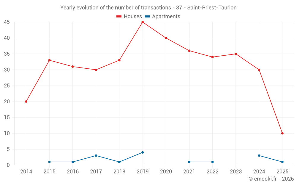 The median price on the 28 house transactions of the last 12 months in the municipality of Saint-Priest-Taurion was 1 604 € per square meter for a median property value of 136 300 €. Over this period, 60% of transactions were between 1 375 and 2 183 € per square meter (from the 2nd to the 8th deciles).