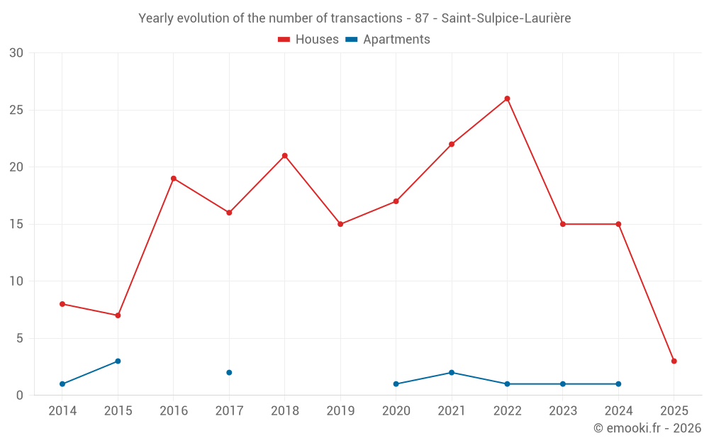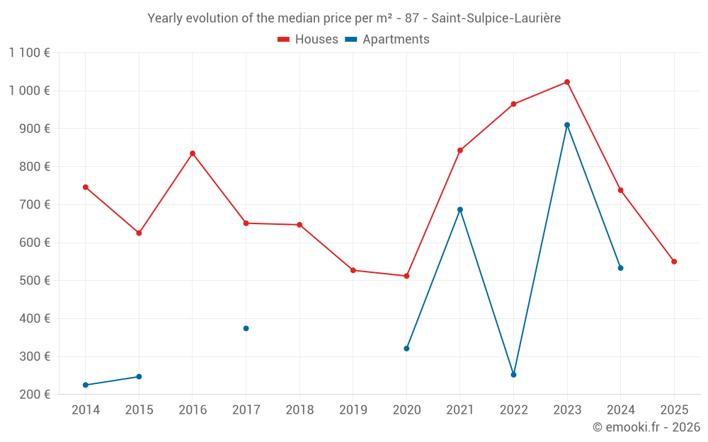 The median price on the 24 house transactions of the last 24 months in the municipality of Saint-Sulpice-Laurière was 824 € per square meter for a median property value of 52 000 €. Over this period, 60% of transactions were between 397 and 1 315 € per square meter (from the 2nd to the 8th deciles).