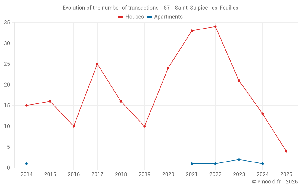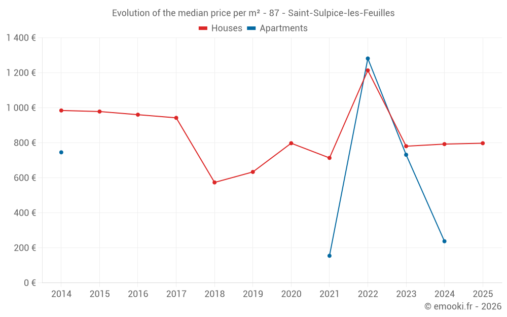The median price on the 29 house transactions of the last 24 months in the municipality of Saint-Sulpice-les-Feuilles was 781 € per square meter for a median property value of 75 000 €. Over this period, 60% of transactions were between 516 and 1 229 € per square meter (from the 2nd to the 8th deciles).