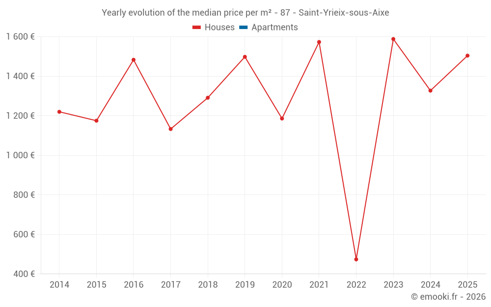 The median price on the 19 house transactions of the last 24 months in the municipality of Saint-Yrieix-sous-Aixe was 1 408 € per square meter for a median property value of 152 000 €. Over this period, 60% of transactions were between 864 and 1 962 € per square meter (from the 2nd to the 8th deciles).
