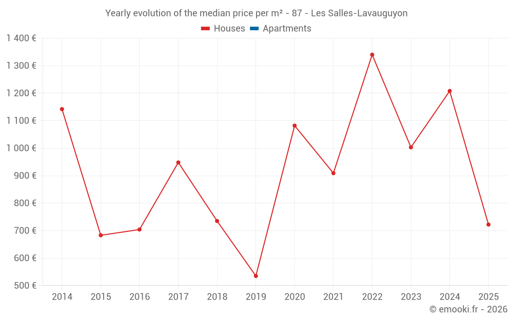 The median price on the 14 house transactions of the last 24 months in the municipality of Les Salles-Lavauguyon was 1 204 € per square meter for a median property value of 104 120 €. Over this period, 60% of transactions were between 888 and 1 518 € per square meter (from the 2nd to the 8th deciles).