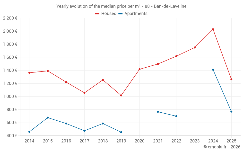 The median price on the 27 house transactions of the last 24 months in the municipality of Ban-de-Laveline was 1 650 € per square meter for a median property value of 155 000 €. Over this period, 60% of transactions were between 909 and 2 387 € per square meter (from the 2nd to the 8th deciles).