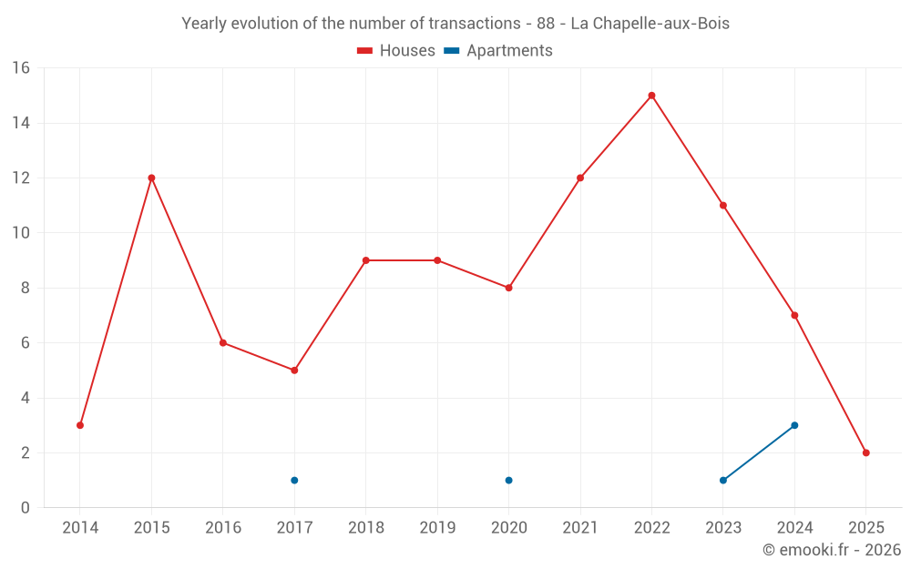 The median price on the 15 house transactions of the last 24 months in the municipality of La Chapelle-aux-Bois was 914 € per square meter for a median property value of 105 000 €. Over this period, 60% of transactions were between 516 and 1 413 € per square meter (from the 2nd to the 8th deciles).